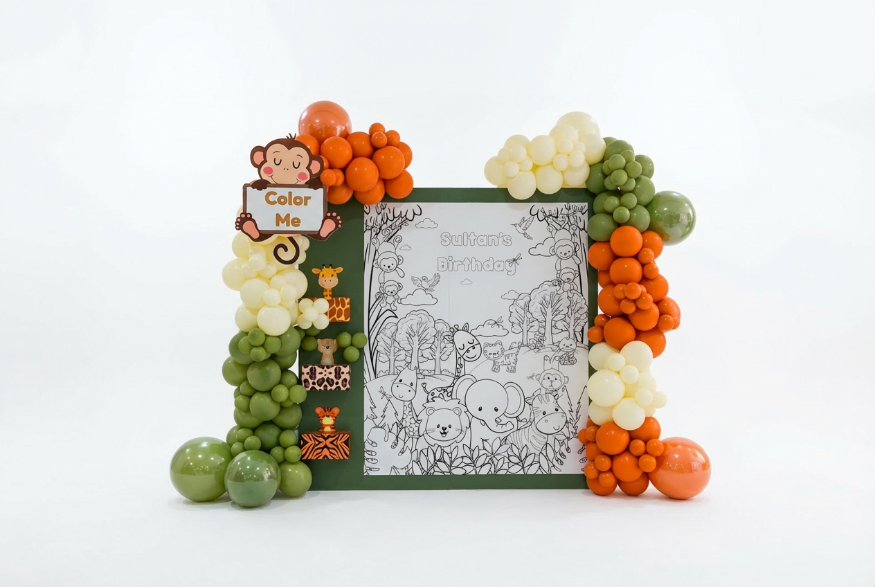 زِد من جمال احتفالك بجدار تلوين تفاعلي. مزيج فريد من الديكور ونشاط ممتع وجاذب. هذه الخلفية الكبيرة والمُصممة خصيصًا تدعو الضيوف من كل الأعمار للمساهمة بلمستهم الفنية، مما يخلق تجربة فنية تعاونية لا تُنسى.