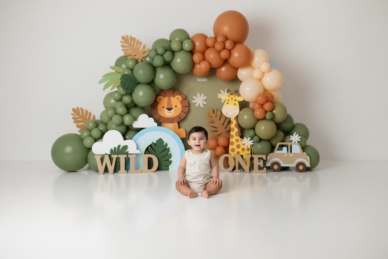 خلفية مستوحاة من أجواء الغابة لعيد ميلاد طفلك/طفلتك الأول، مزينة بتنسيق بالونات بألوان ترابية من الأخضر والبيج والبني مع لمسات من الأوراق استوائية، تكتمل الأجواء بديكورات مرحة على شكل أسد وزرافة وقوس قزح وغيوم وسيارة سفاري. تصميم ممتع وملون ومليء بالمغامرة، مثالي للاحتفالات وجلسات التصوير.