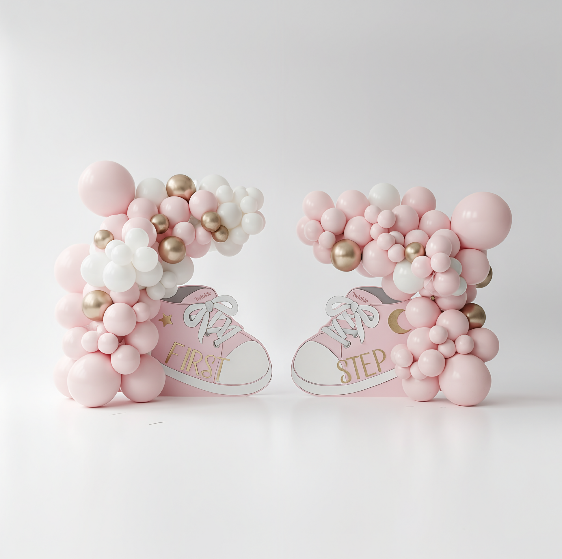 هذه الزينة الرائعة تحتفل بأول خطوة لطفلتك مع حذائين ورديين جذابين. كل حذاء مزين بمجموعة رائعة من البالونات الوردية والبيضاء والذهبية، ومكتوب عليه "الخطوة الأولى"، مما يجعله مثاليًا للاحتفال بإنجاز طفلتك الجديد.