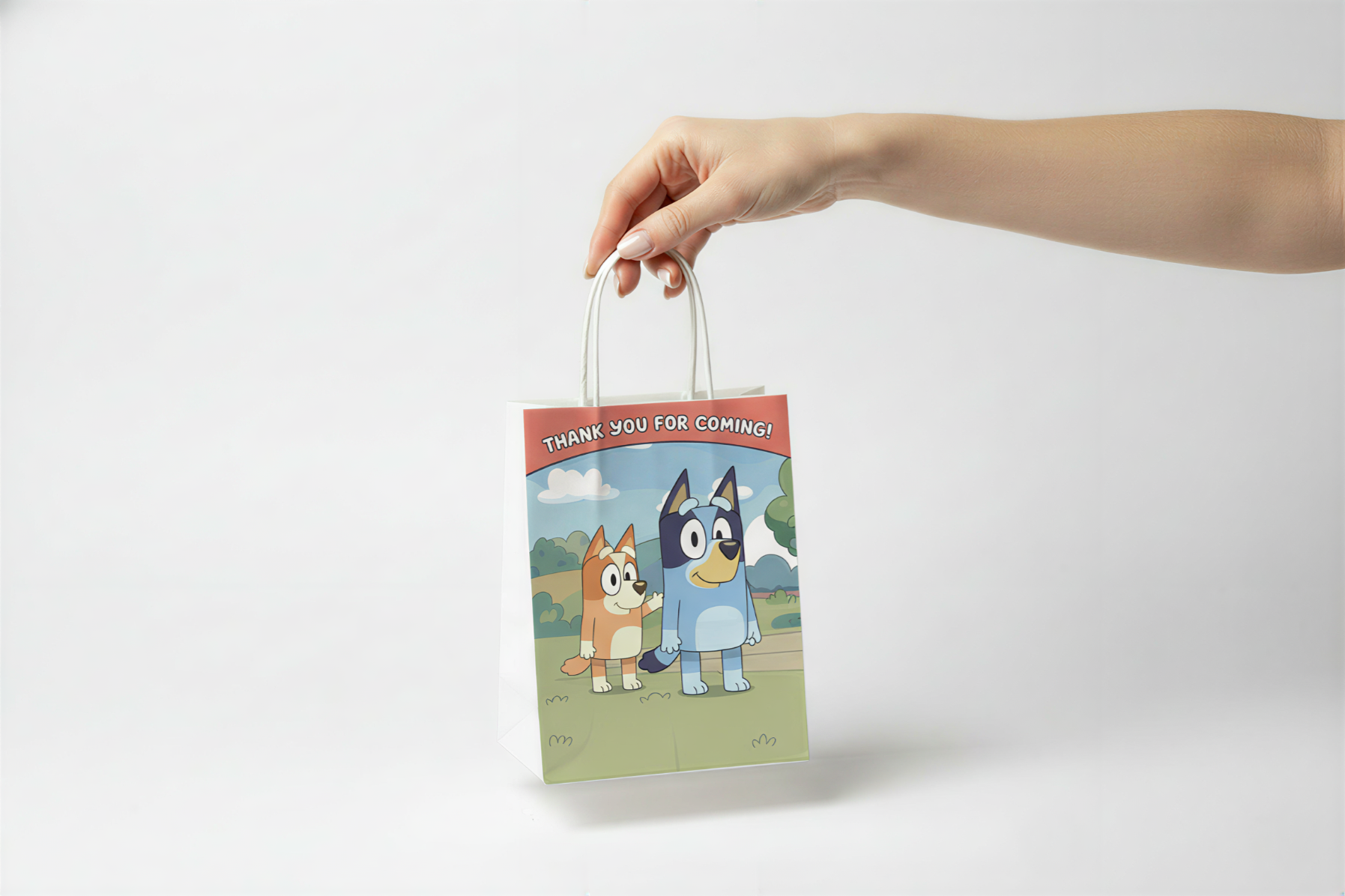 تجي الأكياس في حزمة مكوّنة من ٨ أكياس، وكل كيس عليه ستيكر مطبوع بجودة عالية ومثبّت من الأمام والخلف، ويعرض التصميم اللي تختارينه بشكل واضح وجذّاب. مثالية لتقديم الحلويات، التوزيعات، أو الهدايا الصغيرة. هذي الأكياس طريقة لطيفة ومرتّبة تودّعين فيها الزوّار وتختمين مناسبتك بأجواء حلوة