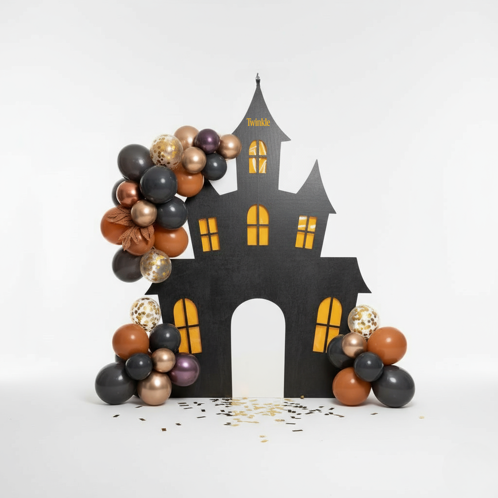 منزل مسكون أسود مميز بنوافذ جميلة، مع أكاليل بالونات أنيقة بدرجات الأسود والبني والمعدني.
