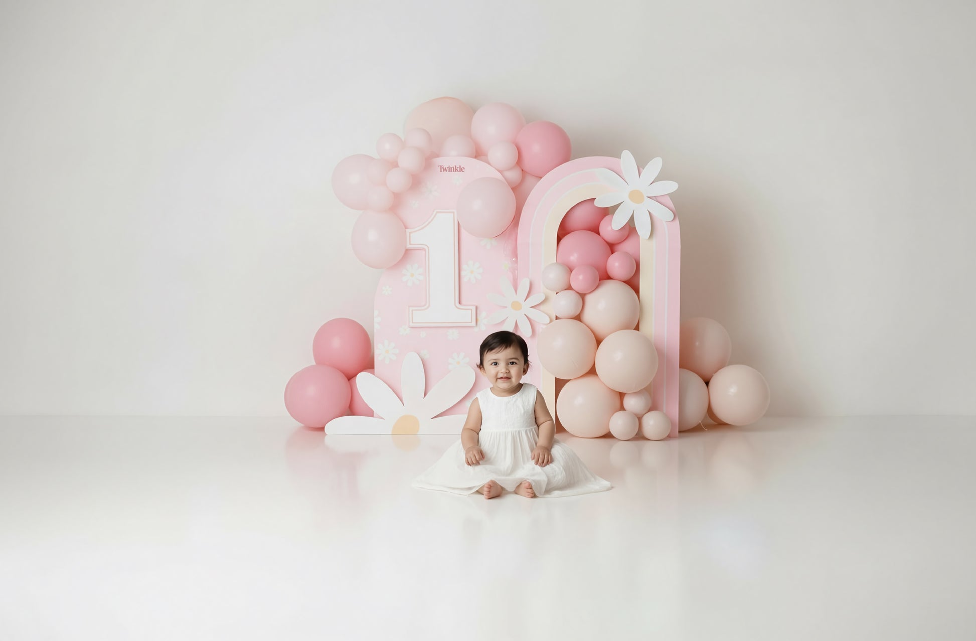 خلفية موردة باللونين الوردي والأبيض لعيد ميلاد طفلتك الأول، بتصميم بارز للرقم (١) مزين ببالونات بألوان الباستيل ولمسات من زهور الأقحوان. يتميز بأسلوب ناعم وأنيق، مما يجعله الخيار المثالي للاحتفالات المميزة وجلسات التصوير.