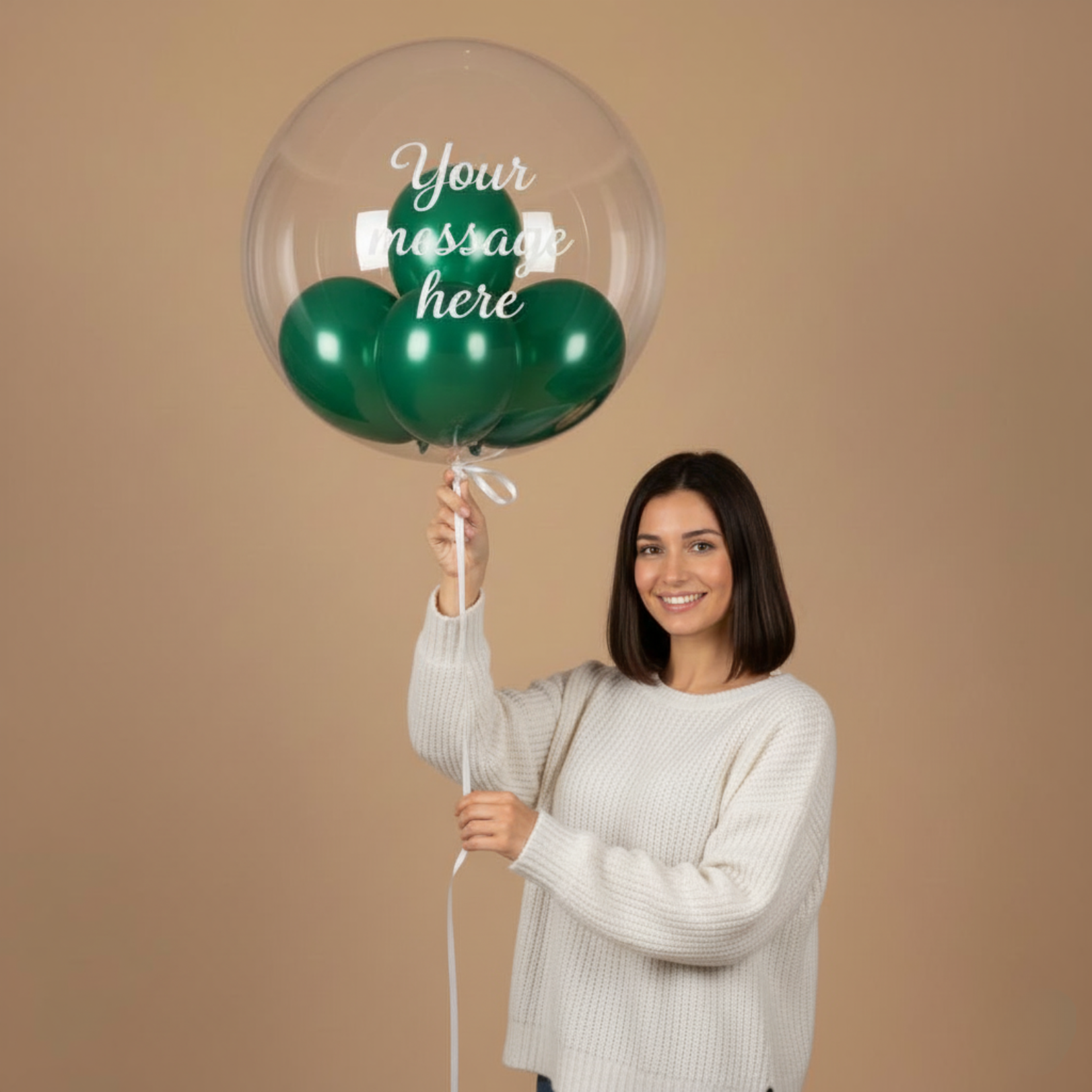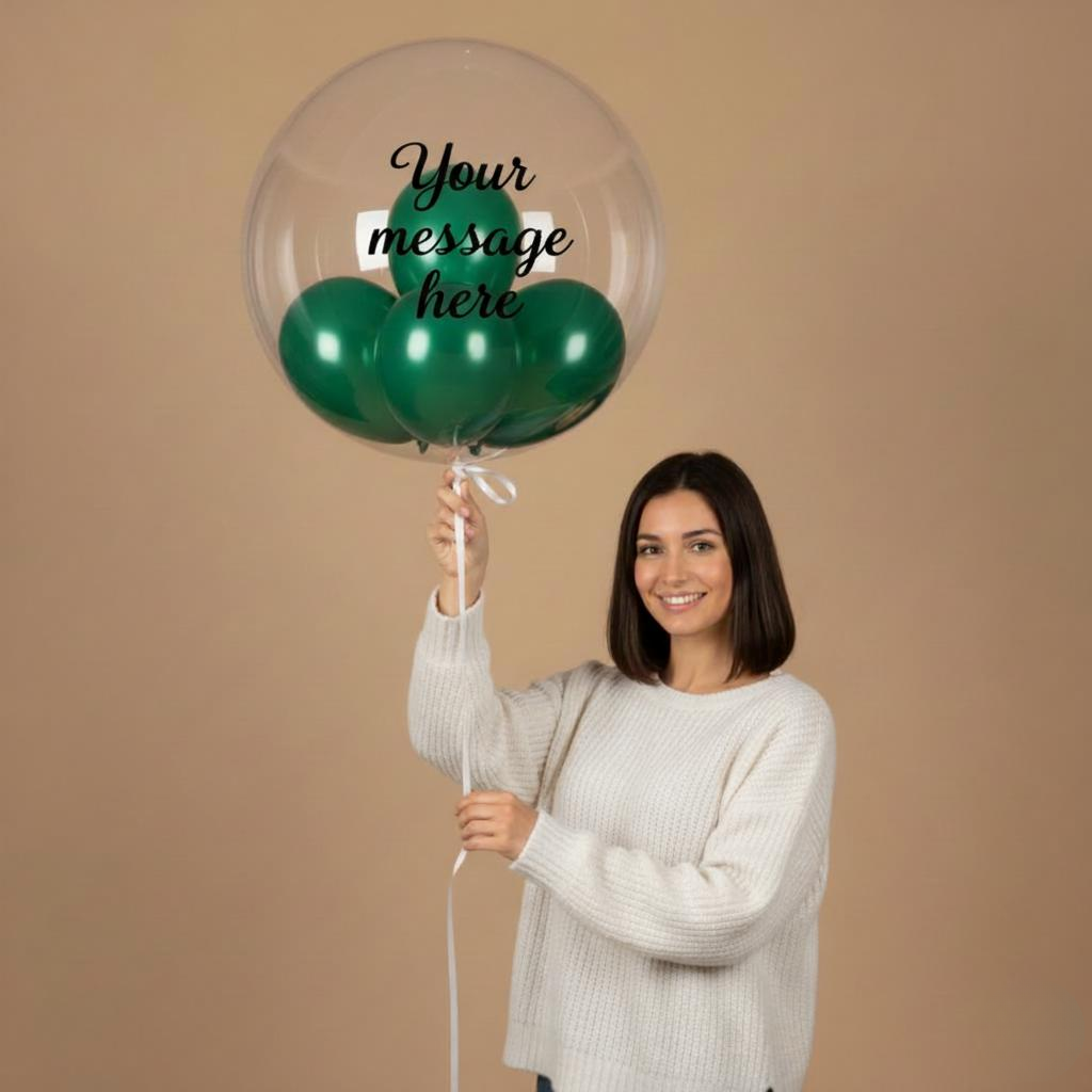 Celebrate in style with our elegant bubble balloon filled with beautifully coordinated mini balloons. Each piece can be customized with your personal message, making it perfect for birthdays, anniversaries, or special surprises. Choose between black or white font to match your preferred look. Delivered inflated and ready to impress, it’s the perfect statement piece for any celebration.