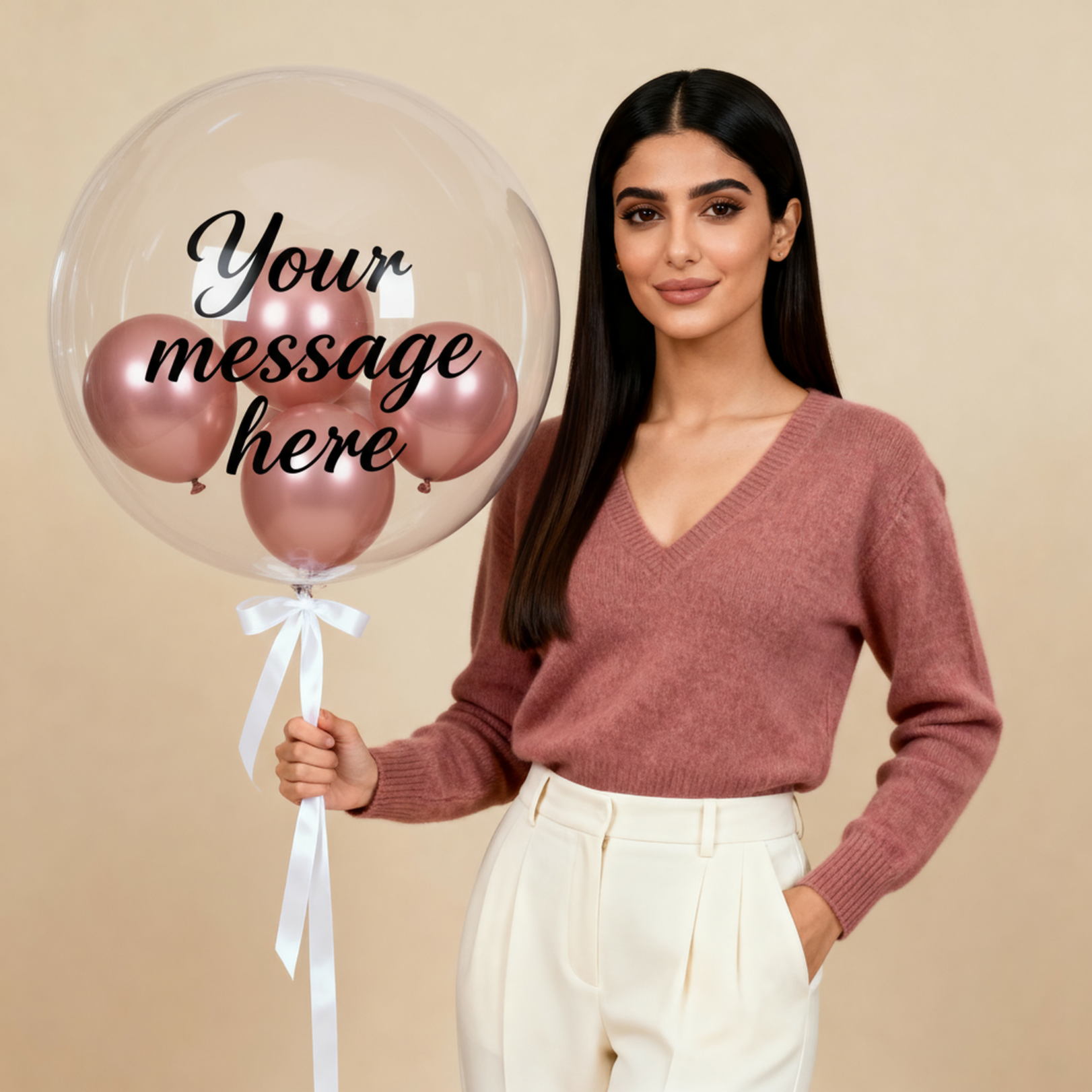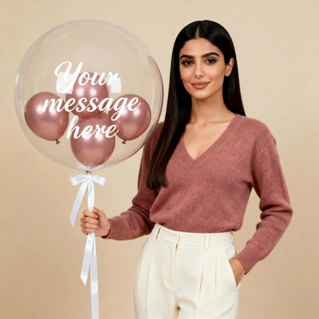 Celebrate in style with our elegant bubble balloon filled with beautifully coordinated mini balloons. Each piece can be customized with your personal message, making it perfect for birthdays, anniversaries, or special surprises. Choose between black or white font to match your preferred look. Delivered inflated and ready to impress, it’s the perfect statement piece for any celebration.