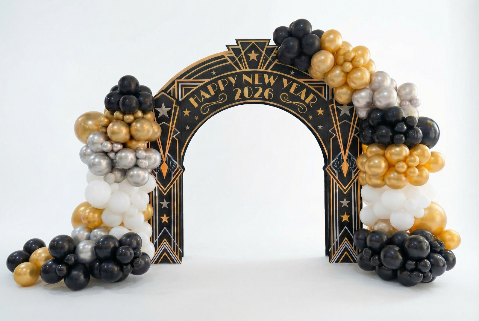 A bold New Year backdrop featuring a 2026 arch design with coordinated balloon clusters on both sides. Perfect for creating a striking entrance, photo moments, and celebrating the new year in style.
